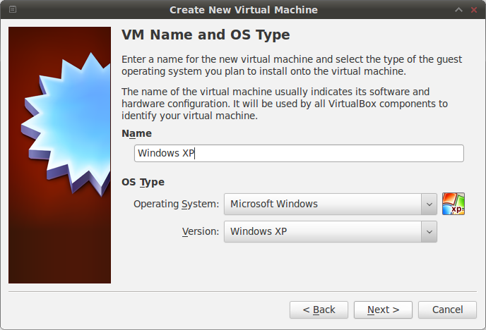 4. Give the name as you wish. I named this “Windows XP”. Then choose the OS Type. Because we want to Install windows xp first make your choice same as the picture below. After that click “Next”