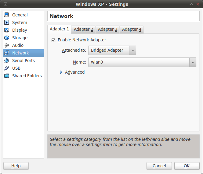 4. As you see that the network system is NAT by the default. Because I have a mini wifi modem I will change this to Bridged Adapter that attached to wlan0 in order to the system to get IP address. Click “OK”.