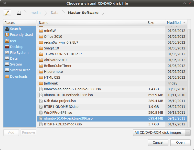 9. Locate the ISO of the Ubuntu that we want to install. Here i use Ubuntu 10.04 Desktop i386.